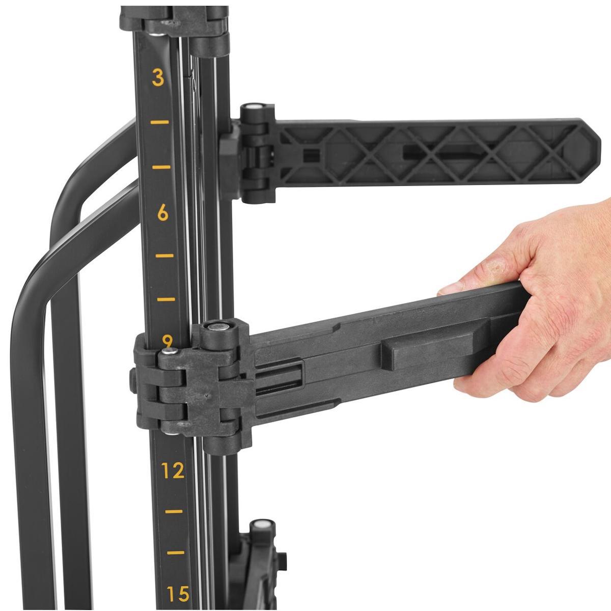 Justerbar höjd och vikbara armar för skräddarsydd användning. Max. belastning armar 70 kg per par. Central låsmekanism för låsning av alla enheter på vagnen. Förvarings på baksidan för längre verktyg.Gummihjul 21cm i diam.
