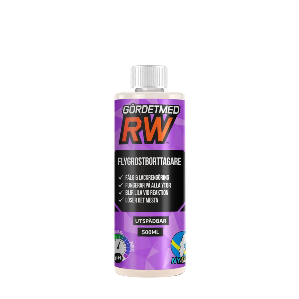 Flygrostborttagare som effektivt avlägsnar flygrost, bromsdamm och inbränd smuts från en mängd olika ytor så som lack, metall, plast och glas. Produkten kan användas outspädd för tuff smuts eller spädas 50/50 med vatten vid lätt nedsmutsning. Flygrostborttagaren kan appliceras på både torra och våta ytor - mindre mängd medel behövs på våta ytor. När medlet reagerar med smutsen ändrar det färg till lila och ger därmed en tydlig indikation på att det arbetar. Sprutmunstycke ingår ej.