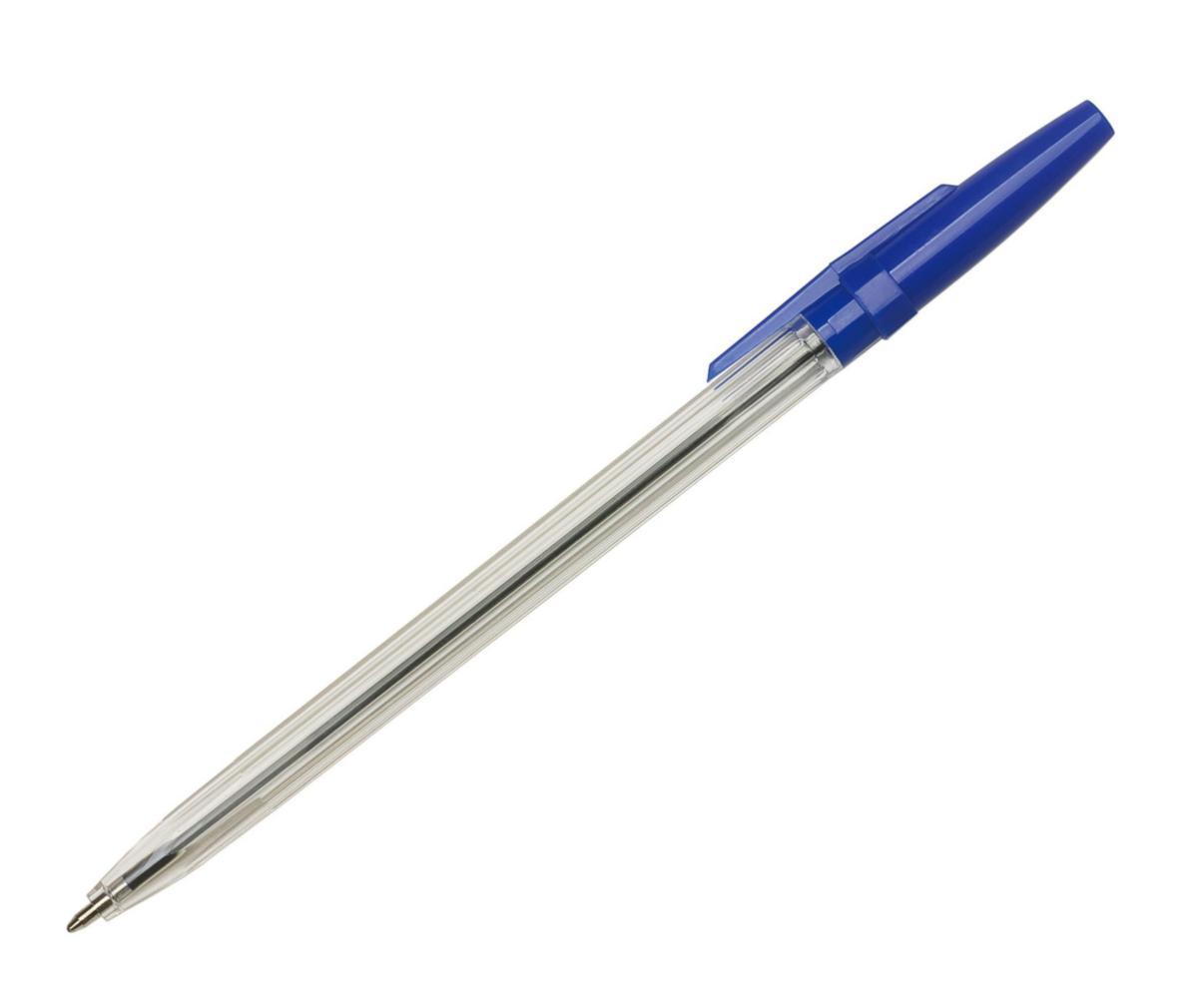 Transparent engångspenna med färgad huv som visar bläckets färg. Blå och svart har dokumentäkta bläck enligt ISO 12757-2. Förpackningen delas ej. Kulbredd 0,8 mm.