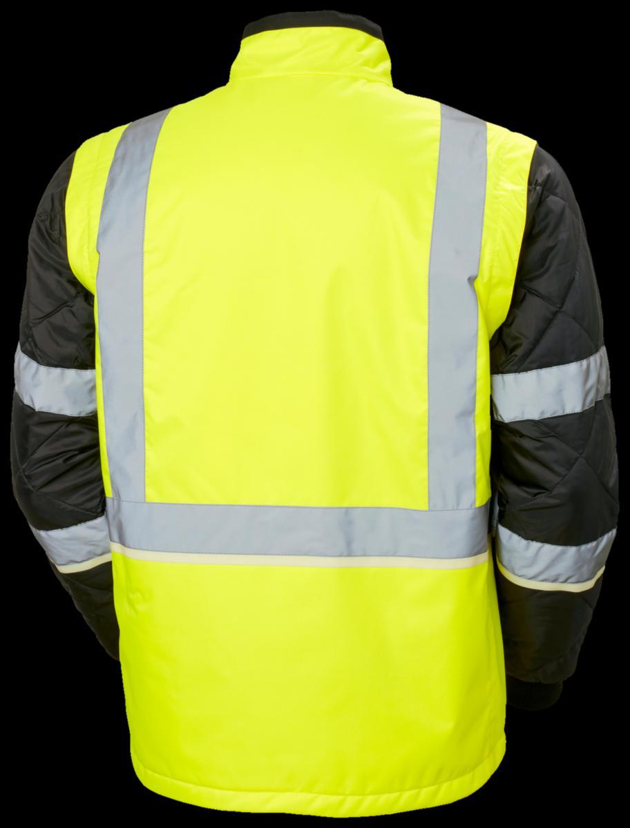 Borstad polyester på insida krage. YKK®-dragkedja fram med hakskydd. Handfickor med YKK®-dragkedja. Dragkedja för dekalmontering. Avtagbara ärmar. Elastiska muddar. Justerbar fåll med elastisk dragsko inuti handfickan. Ögla för ID-kort. Förlängt ryggslut för förbättrad komfort. Zip-in-kompatibel med 71185 UC-ME-skaljacka. Material: 100 % polyester, 210 g/m² . Material 169: 100 % polyester, 200 g/m² . Sekundärt material: 100 % polyester, 210 g/m² . Foder: 100% polyamid. Tvättråd: 40°C. Standard: EN ISO 20471:2013 klass 2 . EN 342:2017 Icler 0,304 m²K/W(B)(1,96 clo) . EN 342:2017 i kombination med stil 71455 & 71456 . EN 342:2017 Icler 0,326 m²K/W(B)(2,10 clo) . EN 342:2017 i kombination med stil 71455, 71456 & 71185 . EN 342:2017 luftgenomträngning klass 3.