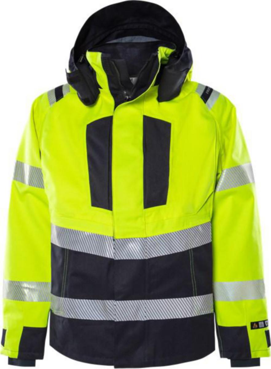 Flamskyddad multinorm skaljacka som är vatten och vindtät med andasfunktion. Bekvämt året runt-plagg med inherent (inbyggt) flamskydd. Teknisk beskrivning: Vatten- och vindtät med andasfunktion / Multinorm / Inherent flamskydd / Smuts-, olje- och vattenavvisande / Avtagbar och reglerbar huva / Tvåvägs dragkedja ända upp i kragen under frontslå med kardborrelås / 2 bröstfickor med dold dragkedja, den ena med invändig D-ring / Kartficka med dragkedja och invändig telefonficka som nås även när plagget är stängt / 2 innerfickor, varav en med dragkedja / 2 fleecefodrade framfickor med dragkedja / Reglerbart ärmslut med invändig elastisk mudd / Förlängd rygg / Reglerbar nederkant med dragsko / Dragkedja i foder för transfer eller brodyr / Vattenpelare 10.000 mm / Andasfunktion RET 14,44. Material: Airtech® vatten- och vindtätt material med andasfunktion. 50% modakryl, 41% bomull, 7% PU, 2% antistatisk fiber, 2-lagers laminat. Tejpade sömmar. Foder 50% aramid, 50% flamskyddad viskos. Vikt: Yttertyg 260 g/m². Foder 130 g/m². Tvättråd: Kan maskintvättas i maxtemperatur 60 °C, normalprogram. Standard: Godkänd enligt EN 61482-1-2 klass 2, EN 61482-1-1 ELIM: 27 cal/cm², EN ISO 11612 A1 A2 B1 C1 F1, EN ISO 11611 A1 A2 klass 1, EN 1149-5, EN 13034 typ PB [6], EN ISO 20471 klass 3 och EN 343 klass 3/4 / Godkänd efter 25 tvättar / OEKO-TEX®-certifierad.