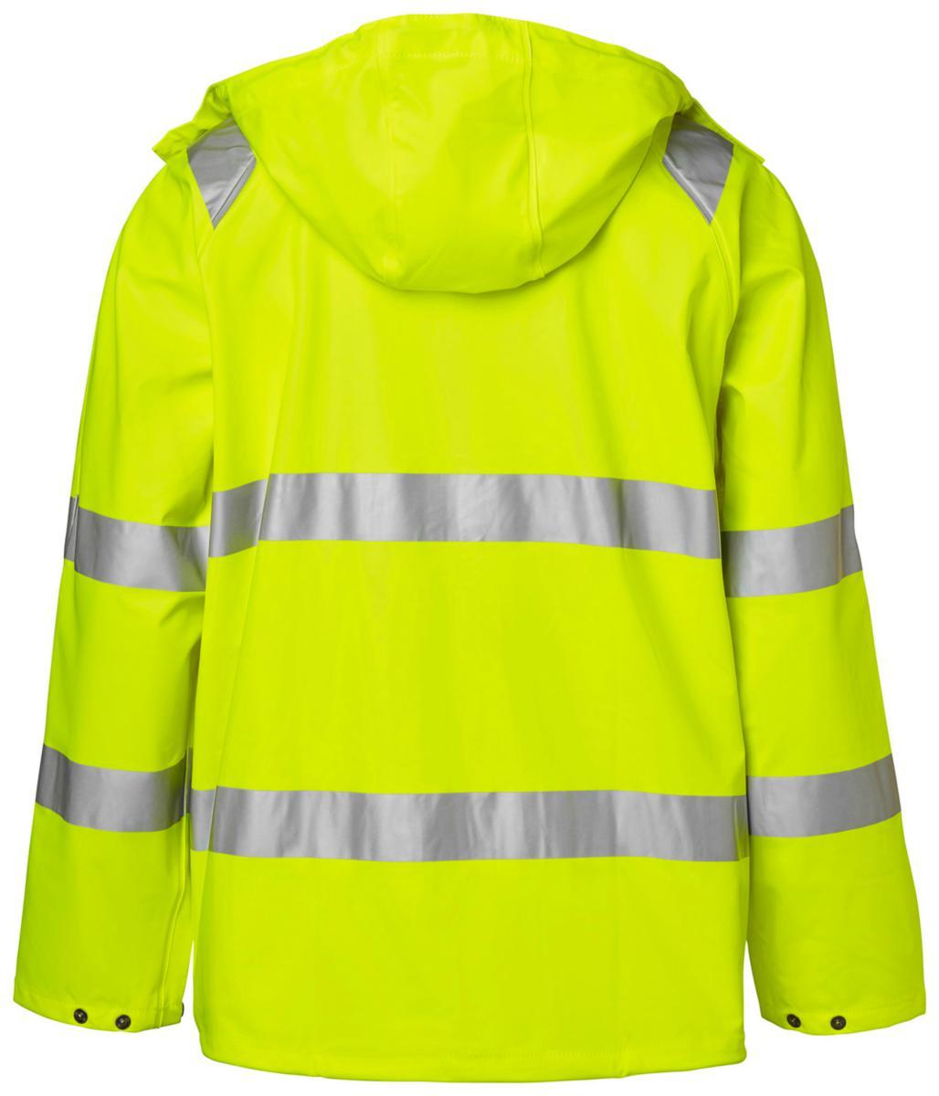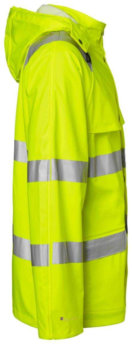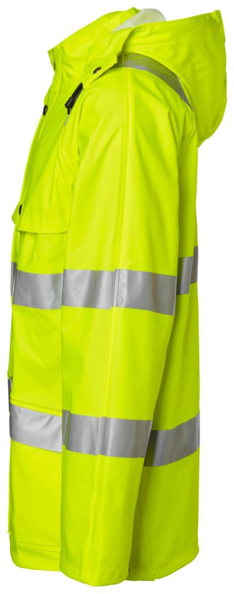 Regnjacka varsel, blixtlås med slå och tryck-knappar. Dold id-kort ficka. Avtagbar huva med knytband. Två framfickor med lock. Innerficka med tryck-knapp. Telefonficka. Ventilation fram och bak. Dragsko i nederkant och reglerbart ärmslut. Material: Polyuretanbelagd stretch. Standard: EN ISO 20471 klass 3, EN 343.