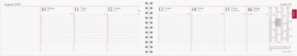 Spiralbunden stor plankalender. En vecka per uppslag. Timindelad 8-18.