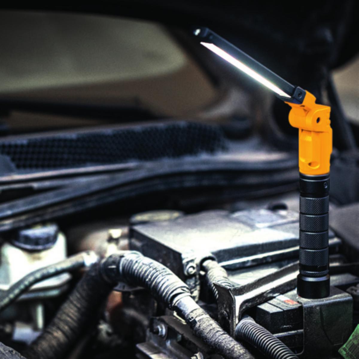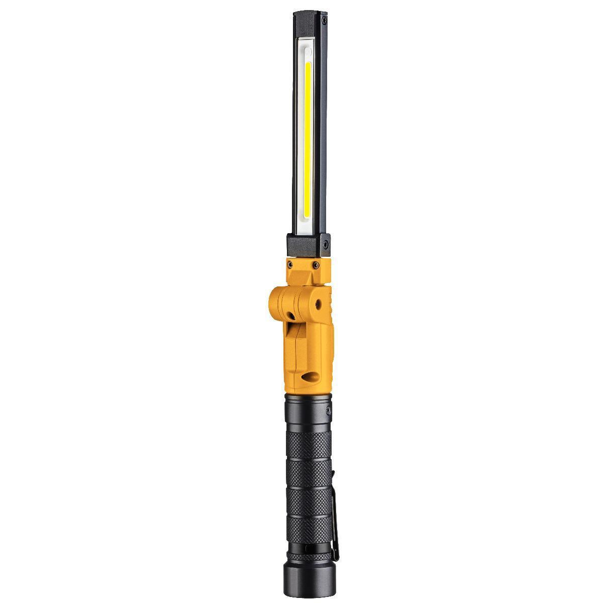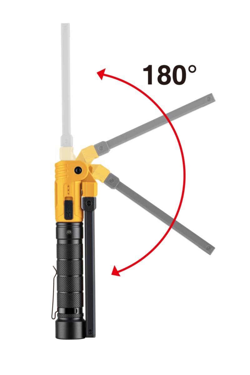 Robust, ledad och ljusstark uppladdningsbar LED-lampa med lamphus av aluminium i slimmat utförande. Grepp i aluminium försett med clips. Bottenplatta med stark magnet. Ställbart arbetsljus i fyra lägen; max 1600 lm samt UV-ljus och toppljus. LED-diod indikerar batterinivå.