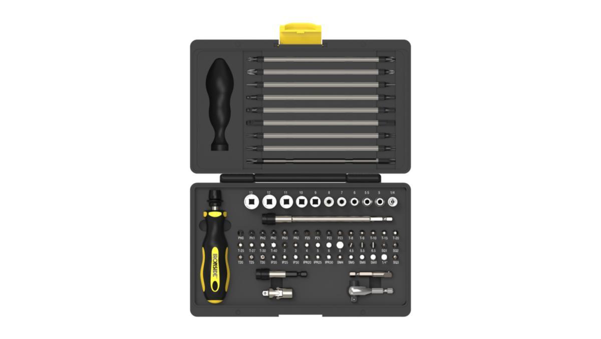 1 st mejsel-handtag med quick release och 2-komponents-handtag, 1 st dubbelt spärr-huvud med ¼" sexkant (för bits) x ¼" tapp 60 mm, 1 st ¼" universalknut, 1 st quick release bitshållare ¼"x 75 mm samt 1 st 175 mm, 1 st quick release hylsadapter ¼" sekant x 1/4" tapp 60 mm, 1 st bitsadapter ¼"x25 mm, 1 st hylsadapter ¼"x25 mm, 10 st ¼" hylsor 5-13 mm.