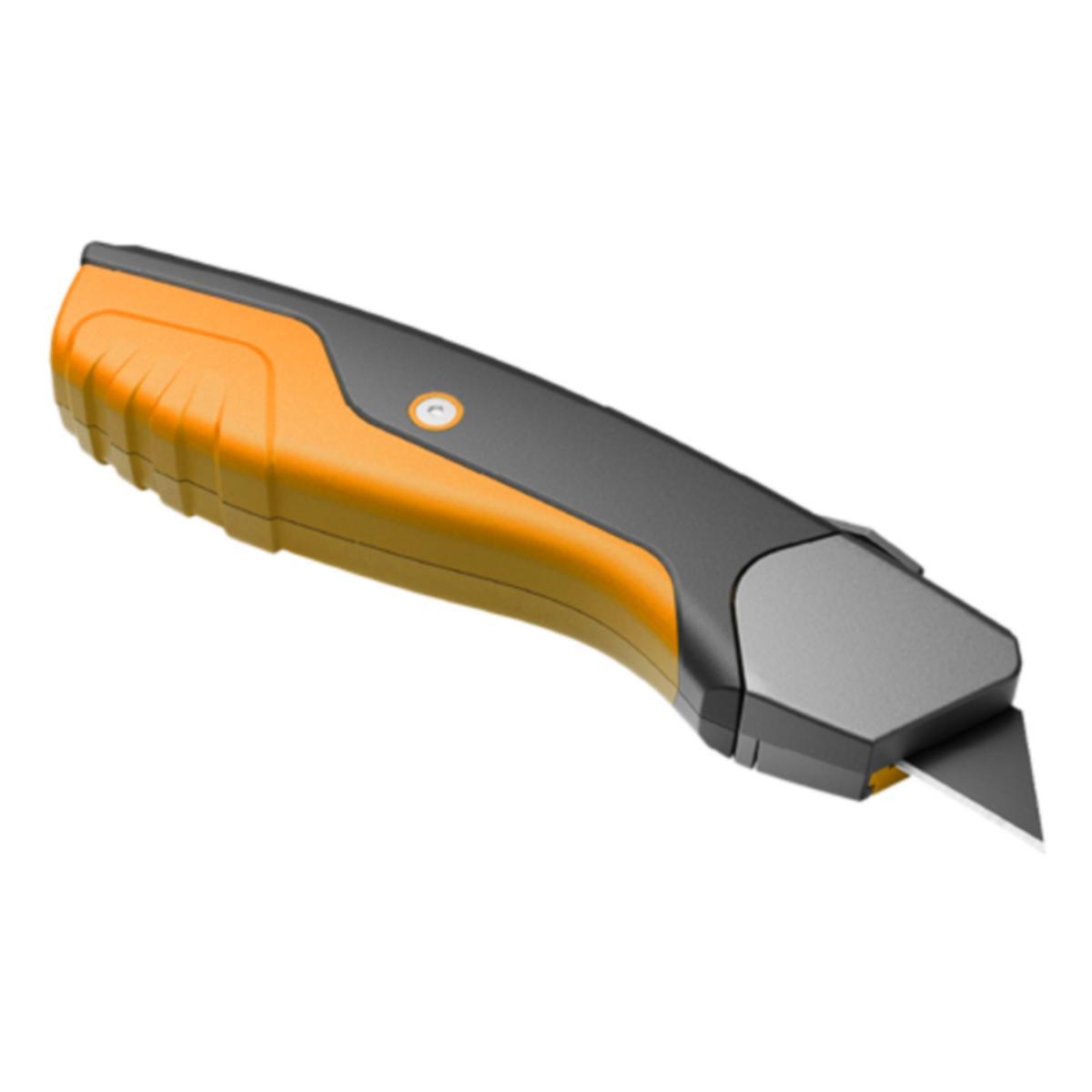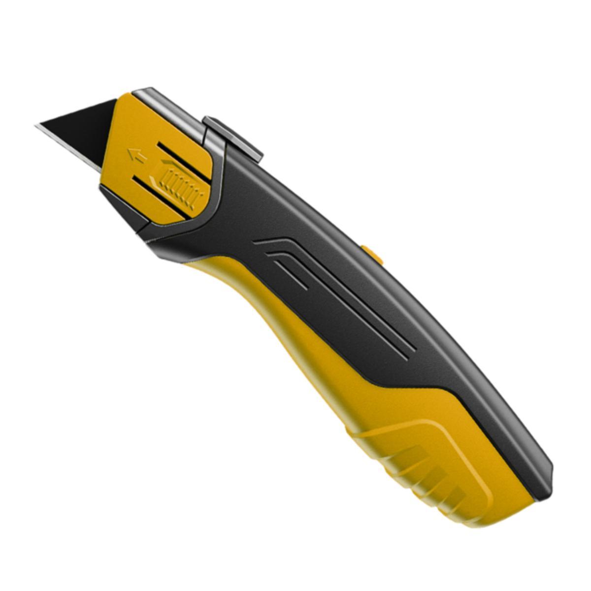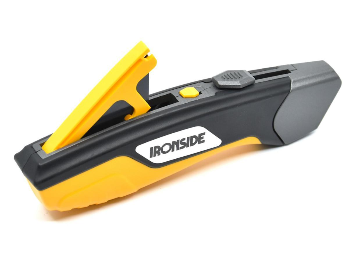 Säkerhetskniv från Ironside med automatisk bladåtergång och SK2H-trapezblad, utformad för att minimera risken för skärskador vid yrkesanvändning. Bladskyddet aktiveras automatiskt oavsett om reglaget är i användning eller inte, vilket ger ett extra skydd vid hantering. Ramen är tillverkad i aluminiumlegering med TPR-förstärkning för att ge ett halksäkert grepp och hög hållbarhet. Bladbyte sker enkelt och utan verktyg genom att skjuta av höljet och använda den integrerade bladhållaren. Kniven är anpassad för både höger- och vänsterhänta användare. Mått: 160x35 mm.