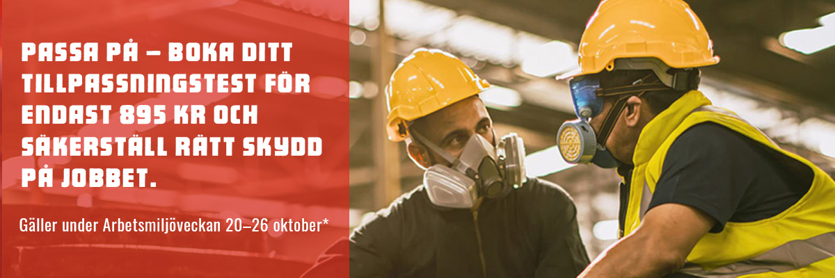 Under Arbetsmiljöveckan 20–26 oktober erbjuder vi ett specialpris på 895 kr för professionella tillpassningstester av andningsskydd. Ett enkelt sätt att säkerställa att ni följer de nya lagkraven – samtidigt som ni skyddar era medarbetare på riktigt.